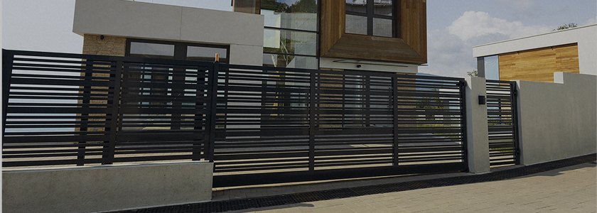 На фото: откатные ворота и калитка с заполнением из алюминиевых профилей шириной 82 мм.